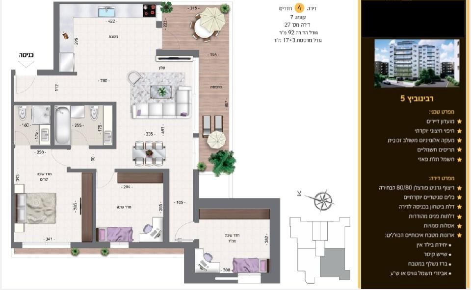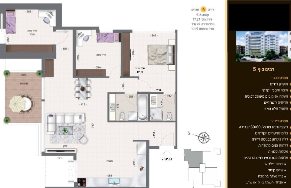 • קומה 5 — 97 מ״ר + מרפסת 9 מ״ר, צפון-מערב — 2,350,000 ₪